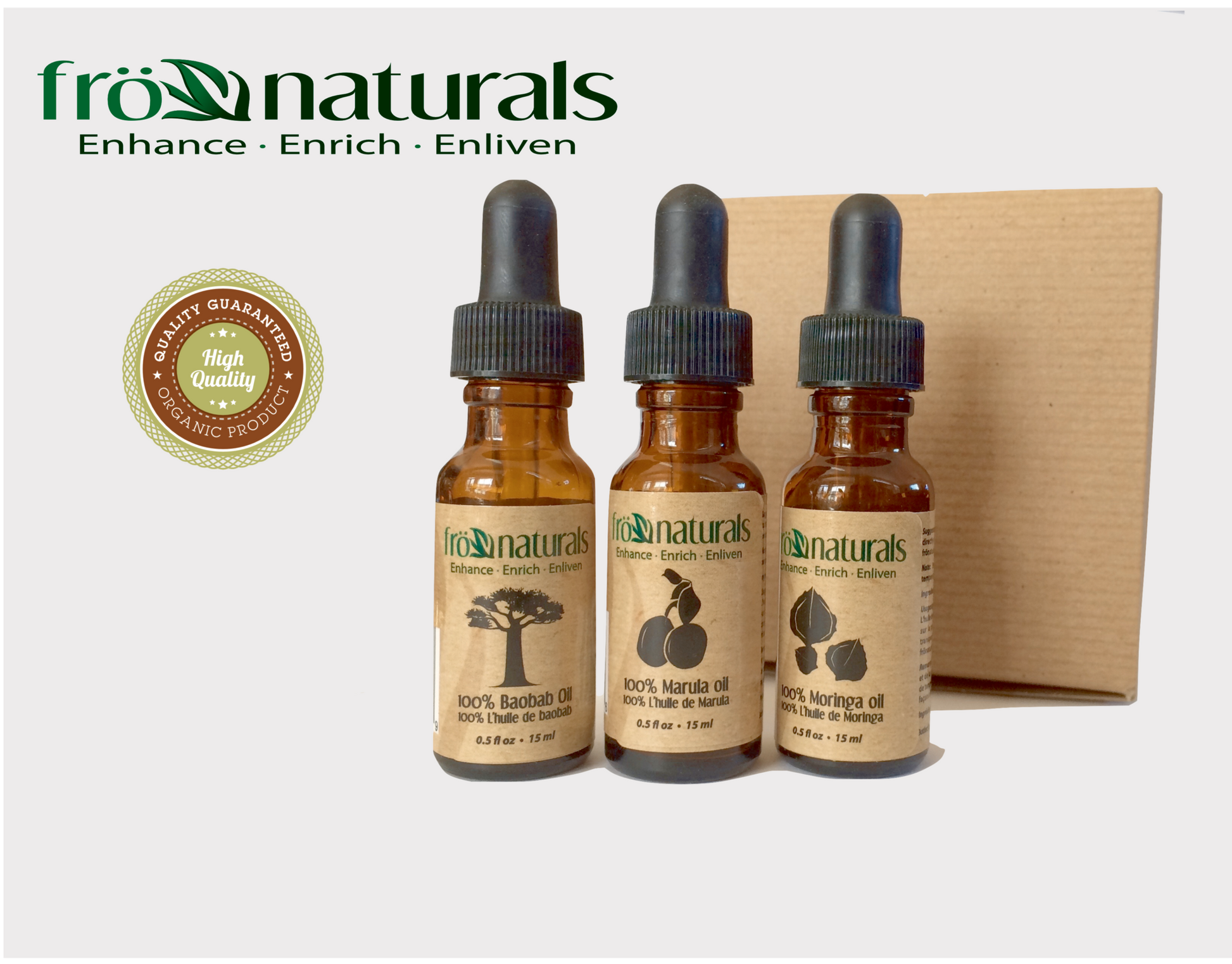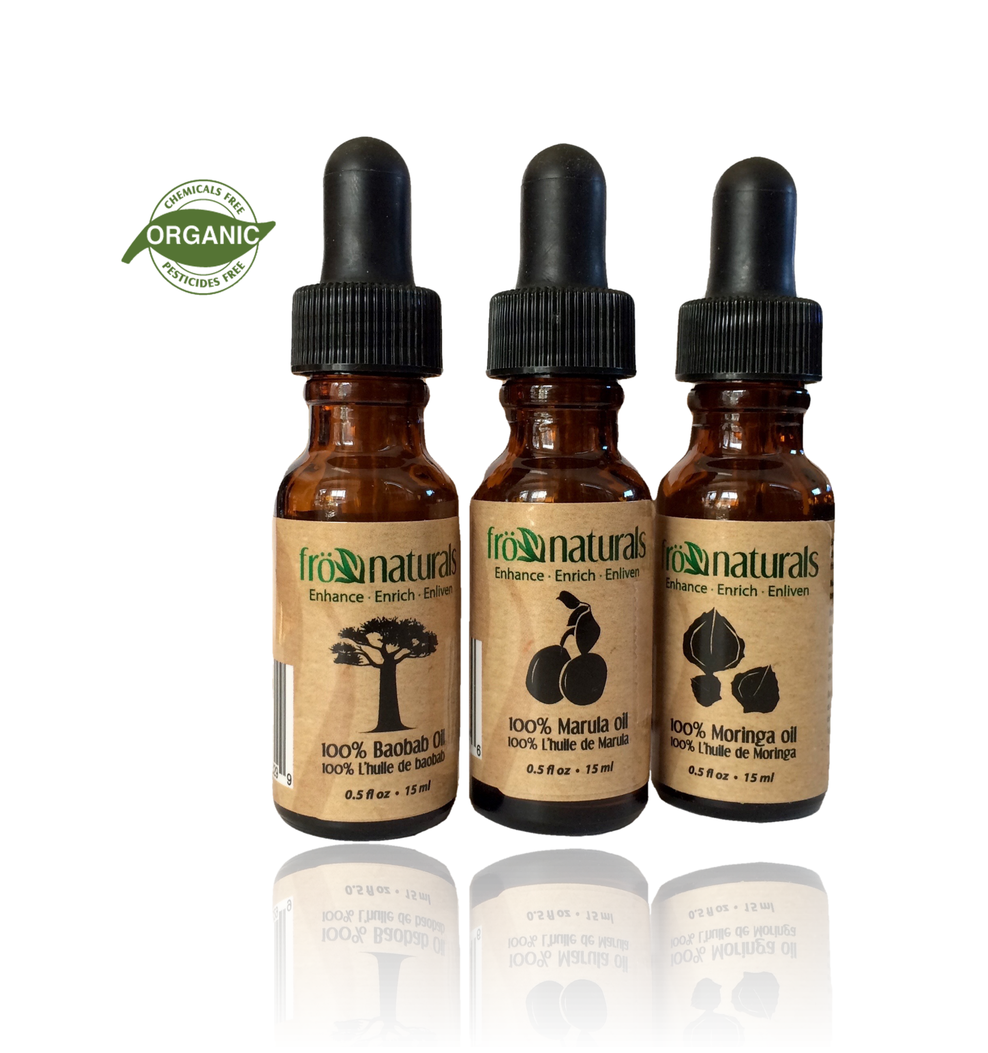 Pack includes: .05oz. African Baobab Oil, .0.5 oz. Marula Oil, .0.5oz. Moringa Oil